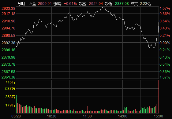 2019年5月28日,MSCI扩容第一次生效,大盘指数出现尾盘暴力拉升现象,上证指数尾盘翻红直线拉升突破2900点,涨幅接近0.65%。