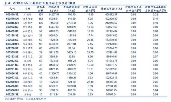 安信证券梳理了一份计算机行业的基金持仓市值前20的名单。按照市值高低,它们依次是广联达、恒生电子、宝信软件、卫宁健康、启明星辰、美亚柏科、亿联网络、用友网络、科大讯飞、恒华科技、石基信息、同花顺、创业慧康、华宇软件、中国长城、浪潮信息、泛微网络、四维图新、中国软件、卫士通。其中,持有广联达的基金数量为128只,基金持股市值最高,为468873万元。持有卫士通的基金数量为15只,基金持股市值最低,为76167万元。