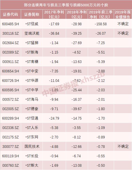 Wind数据显示,此前连续两年亏损且三季报亏损超过5000万元的股票,共有16只,包括14只*ST股票和2只创业板股票。