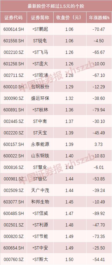 Wind数据显示,截至12月6日收盘,A股共有21只个股的股价低于1.5元(剔除停牌股与退市股)。一旦跌破其面值(1元)连续20个交易日,这些股票也将开始退市倒计时。
