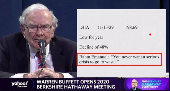 此外,巴菲特在PPT引用前白宫总管拉姆·伊曼纽尔(Rahm Emanuel)的话:“千万不要白白浪费一次严重的危机”。