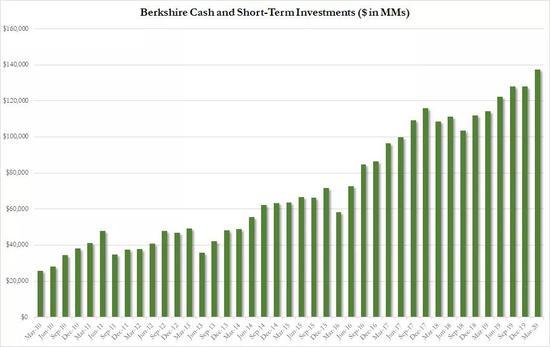 截止一季度末,伯克希尔账面上现金达到创纪录的1370亿美元,比去年底又高了大约100亿美元。