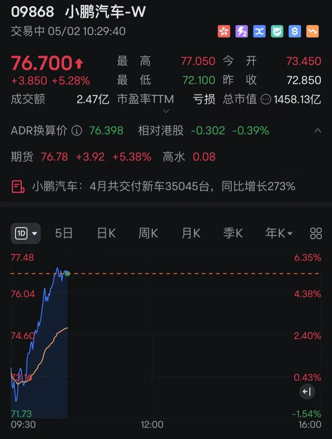 小鹏汽车港股涨超5%,5月1日,小鹏汽车公布最新交付成绩。2025年4月,小鹏汽车共交付新车35045辆,同比增长273%,环比增长6%。小鹏MONA M03上市8个月累计交付超10万辆;小鹏P7+上市5个月,近日已完成第5万台新车下线。2025年1月—4月,小鹏汽车累计交付新车共129053辆,同比增长313%。