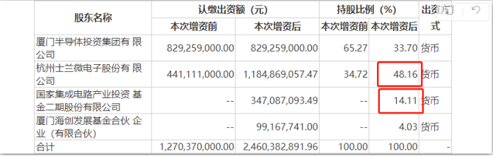 在本次增资前,士兰微仅持有士兰明镓34.72%股权,增资后持股比例升至48.16%,大基金二期持有14.11%股份,海创发展基金持有4.03%股份;而原来的第一大股东厦门半导体放弃同比例增资的权利,因此股份被稀释至33.7%。