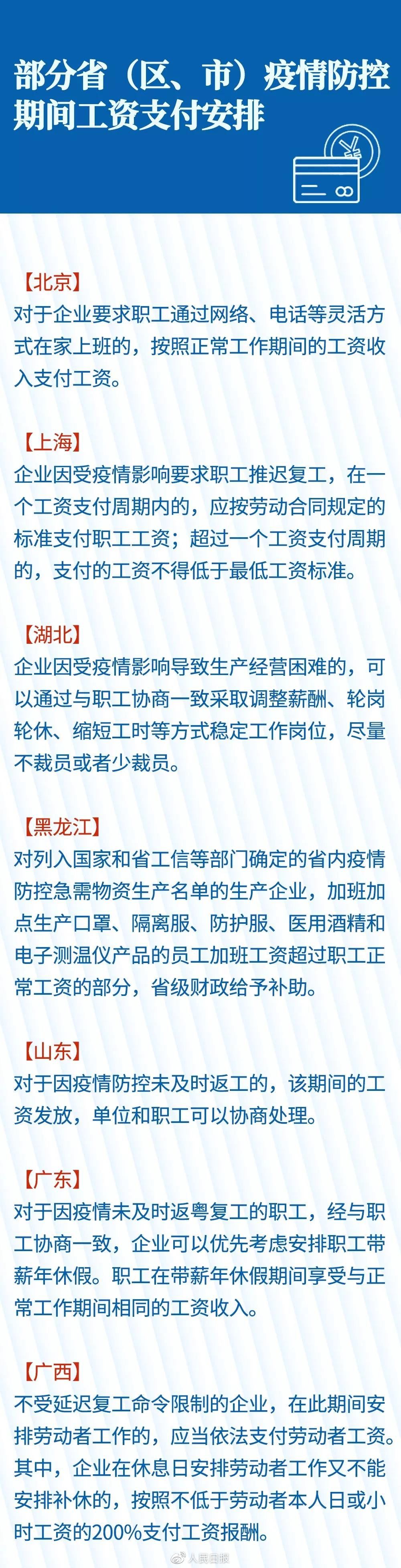 北京市人社局明确,对于企业要求职工通过网络、电话等灵活方式在家上班的,按照正常工作期间的工资收入支付工资。江苏也提出,对企业要求职工通过远程办公等形式提供正常劳动的,依法支付工资。四川、云南等省明确,春节法定假期期间(1月25日—27日),因疫情防控不能休假的职工,应根据劳动法规定支付不低于本人工资的300%的工资。