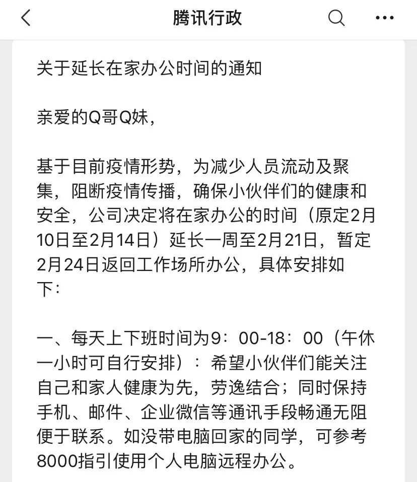 2月9日凌晨,腾讯宣布延长在家办公时间,将复工日期暂定为2月24日。