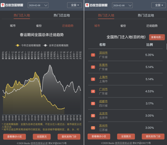 根据百度地图的全国迁徙实况,1月25日之后,今年全国总体迁徙规模指数相比去年出现了断崖式下跌,并在2月5日下降至最低,原本应该在1月31日前后出现的节后返程高峰也消失不见。