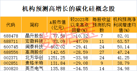 根据5家以上机构一致预测,今后三年净利润增速均有望超20%的概念股仅7只,分别是北方华创、闻泰科技、高测股份、英杰电气、麦格米特、晶升股份、宏微科技。