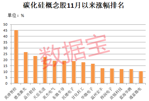数据宝统计,11月以来碳化硅概念股整体表现较强,14股累计涨幅超10%,如英唐智控、德龙激光、晶升股份、天岳先进、英杰电气等。