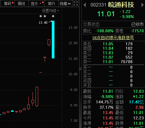 皖通科技盘中出现巨幅震荡,早盘以涨停价开盘,随后股价大幅下探,收盘跌停,上演了“天地板”的剧情。该股开盘集合竞价成交12.76万手,约合资金1.7亿元。若早盘成交买入的投资者,收盘时浮亏比例达到18.14%。盘后龙虎榜交易数据显示,两机构席位合计净卖出3310万元。