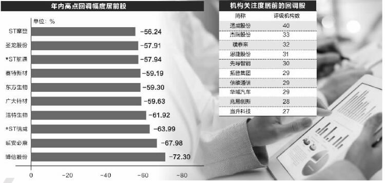 除博信股份外,还有22只股票回调幅度超50%。其中,延安必康最新价7.94元,较年内高点24.8元下跌近68%;*ST信威最新价1.48元,年内高点4.11元,回调近64%。还有洁特生物、广大特材、东方生物等个股回调幅度居前。