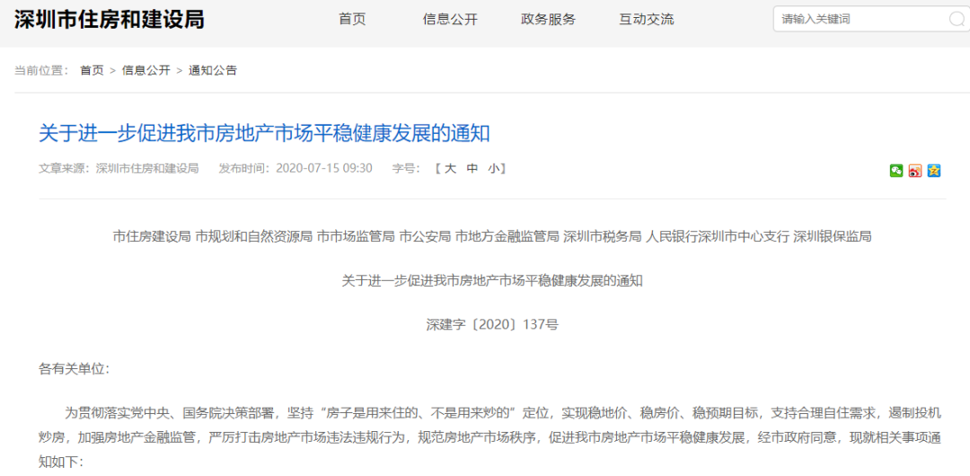 7月15日,深圳市住建局、市规自局、市市场监管局、市公安局、市地方金融监管局、市税务局、人民银行深圳市中心支行、深圳银保监局等8个部门联合发布《关于进一步促进我市房地产市场平稳健康发展的通知》。