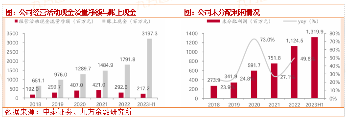 经营活动现金流充沛,稳健经营积累高分红。2018-2022年,公司经营活动现金流充裕,充沛账上现金为公司经营活动提供有力支撑,2022年经营活动现金流量净额与账上现金分别达2.9亿元和17.9亿元。同时,公司滚存未分配利润逐年增加,2023H1未分配利润已达13.2亿元,拥有高分红预期。