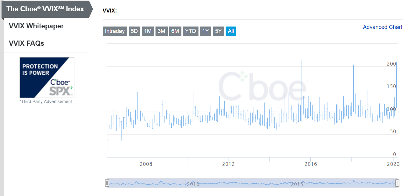 本周一,美股一周内第三次触发熔断,这也是美股史上第四次熔断。三大股指当日的跌幅均超11%,创下1987年“黑色星期一”以来的最大单日跌幅。恐慌指数VIX在周二暴涨42.99%,收报82.69,创下收盘纪录新高。