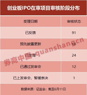 以创业板在审IPO企业为例,“已反馈”阶段有91家,“预披露更新”有68家,已受理有24家。