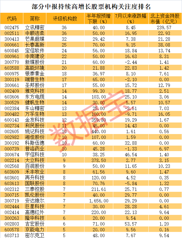 随着上市公司半年报披露逐步开启,市场焦点往往集中在半年度业绩预期上,尤其是净利持续高增长的股票。证券时报·数据宝统计显示,以今年半年报预告净利增速下限计算,评级机构在5家以上的个股中,只有37只2018年半年报、去年半年报以及今年半年报净利同比增速均在20%以上。这其中诞生了多只十倍大牛股,且北上资金大幅重仓。