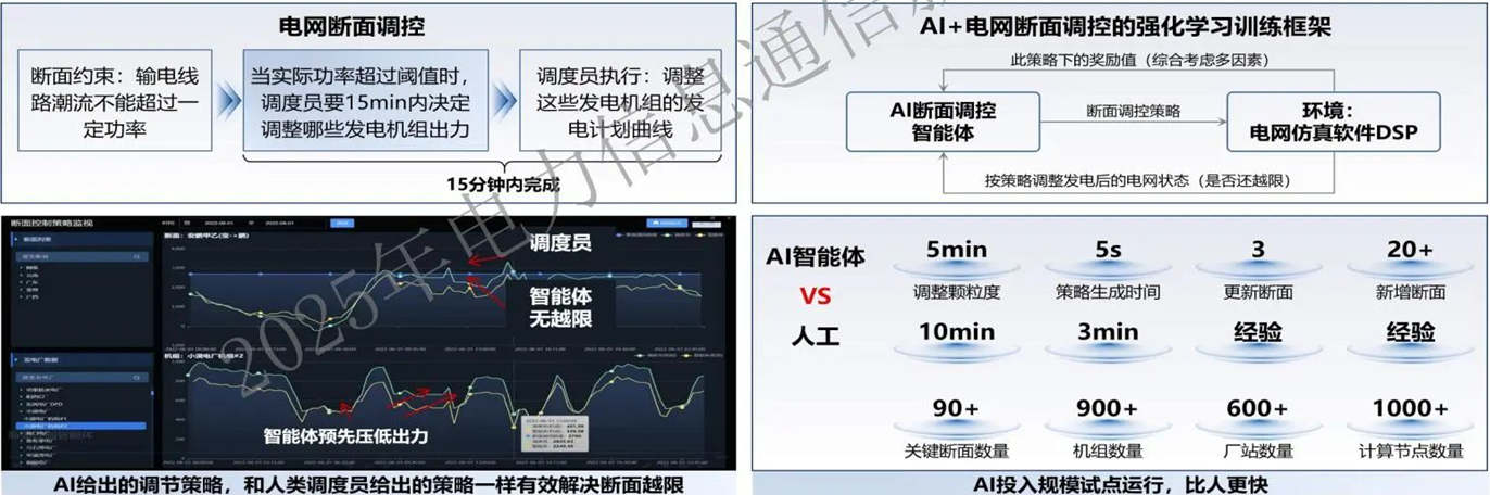 南网采用人工智能技术开发支撑极端场景的电网断面控制智能体,运用专家综合引导机制,结合多目标强化学习算法,将传统电力机组运行方案测算时间从15分钟压缩至一秒内完成,实现对电网断面的秒级感知智能预测与智能调控。