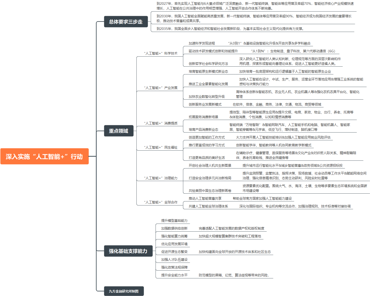 2025年8月26日国务院发布《关于深入实施“人工智能+”行动的意见》,指出以科学技术、产业发展、消费提质、民生福祉、治理能力与全球合作6大领域为重点实施“人工智能+”行动,并从8个方面强化基础支撑能力。同时还对人工智能的发展普及提出量化目标。