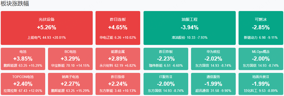 板块方面,光伏储能、算力硬件、算电协同等板块表现活跃,油气、化工等板块表现落后。截至收盘,沪指涨0.16%,深成指涨1.57%,创业板指涨3.3%。