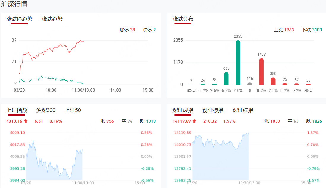沪指盘中再度翻红,创业板指大涨超3%,突破前高。黄白二线分化严重,权重股走势较强。沪深两市半日成交额1.44万亿,较上个交易日放量1392亿。全市场超3200只个股下跌。从板块来看,储能概念快速走强,首航新能、德业股份涨停续创历史新高,正泰电源反包涨停。算力硬件概念盘中走高,源杰科技触及20CM涨停,新易盛涨超8%创历史新高,中际旭创、长光华芯、光库科技等多股大涨。电力板块反复活跃,华电辽能5连板,韶能股份3连板,银星能源、广西能源涨停。下跌方面,化工板块下挫,潞化科技触及跌停,金牛化工、金正大、红宝丽等多股大跌。