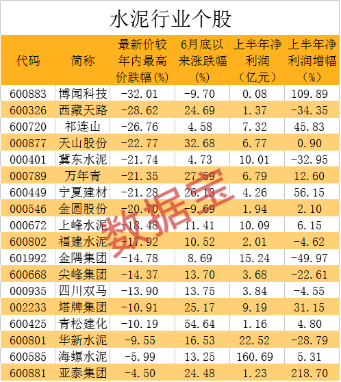 从上半年业绩情况来看,业绩增幅居前得有亚泰集团、博闻科技,上半年净利润同比增长为218.7%、109.9%;宁夏建材、祁连山、塔牌集团净利润增幅也居前。