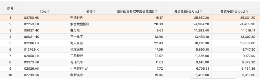 这些巨额募资项目多来自内地。choice数据显示,宁德时代、紫金黄金国际、赛力斯、三一重工、海天味业年内募资净额居前分别为353.31亿元、244.69亿元、140.16亿元、133.07亿元、100亿元,融资金额均在百亿元以上。