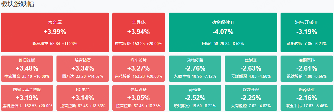 板块方面,贵金属、半导体、太空光伏、培育钻石等板块表现活跃,生物疫苗、石油、煤炭、电池产业链等板块表现落后。截至收盘,沪指涨0.18%,深成指涨0.09%,创业板指涨0.71%。