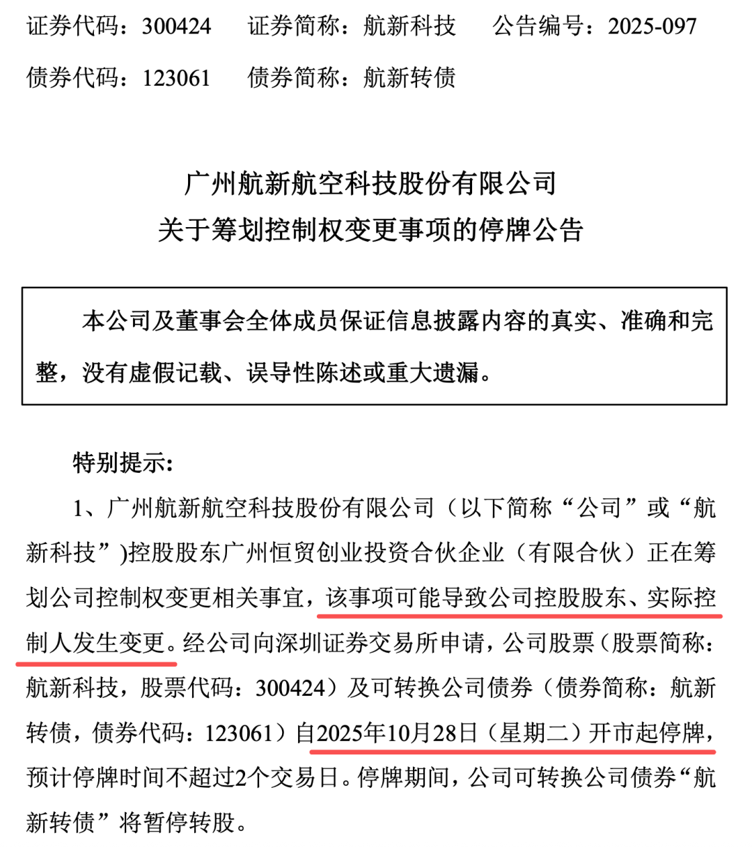 航新科技股票及可转换公司债券自10月28日开市起停牌,预计停牌时间不超过2个交易日。公司公告表示,目前,各方主体正在就具体交易方案、协议等相关事项进行论证和磋商,具体情况以各方签订的相关协议为准。待相关事项确定后,公司将及时发布相关公告并申请复牌。