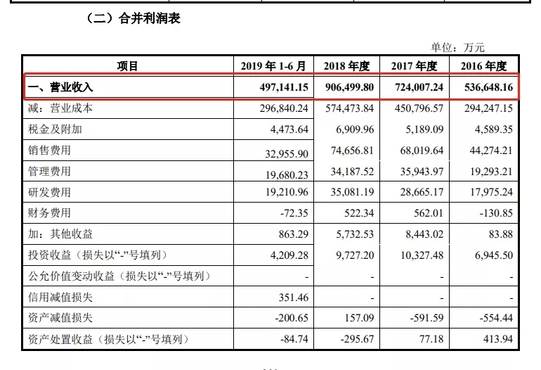 招股书显示,2019年上半年公司营业收入为49.71亿元,2016年-2018年,营收分别为53.66亿元、72.40亿元和90.65亿元;2019年上半年净利润为10.66亿元,2016 年-2018 年净利润分别为14.07亿元、12.85亿元、16.77亿元。