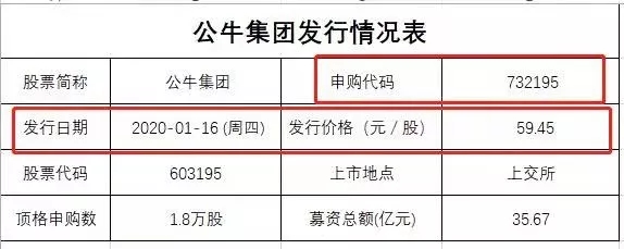 股票简称:公牛集团;申购日期:1月16日;申购代码:732195;发行价格:59.45元/股;顶格申购:1.8万股。中一签1000股,如果4-5个涨停,盈利预计达5、6万。