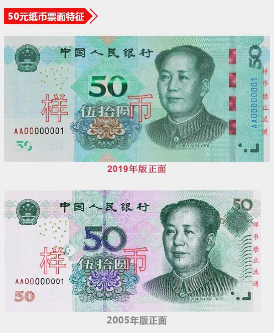 央行介绍,2019年版第五套人民币50元、20元、10元、1元纸币分别保持2005年版第五套人民币50元、20元、10元纸币和1999年版第五套人民币1元纸币规格、主图案、主色调、“中国人民银行”行名、国徽、盲文面额标记、汉语拼音行名、民族文字等要素不变,提高了票面色彩鲜亮度,优化了票面结构层次与效果。
