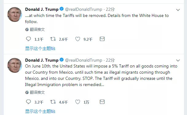 美东时间5月30日,特朗普发推特表示,将从6月10日起,对所有墨西哥输美产品征收5%的关税,直到非法移民不再通过墨西哥进入美国。