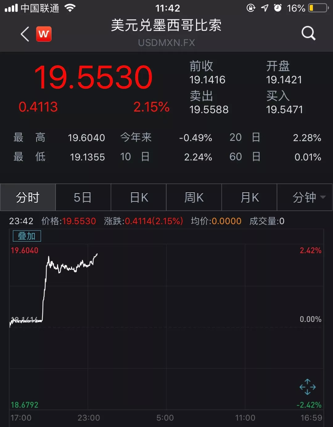 受此消息影响,美元兑墨西哥比索瞬间直线拉升,涨幅迅速扩大至2%,目前仍在持续上涨,涨幅超2.1%。