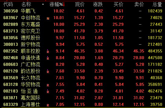 仓储物流板块今日盘中震荡拉升,截至收盘,华鹏飞、中创物流、东方嘉盛、密尔克卫、德邦物流、新宁物流等涨停,顺丰控股涨逾9%。