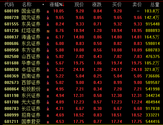 受政策利好刺激,券商板块今日盘中整体走强,个股全线飘红。截至收盘,国金证券涨停,国元证券逼近涨停,东吴证券涨逾8%,海通证券、红塔证券涨幅超6%。