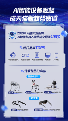根据淘宝提供的数据,今年天猫“38焕新周”期间,AI智能设备新品首发数量同比增长100%,其中智能机器人、智能眼镜、 智能翻译机、AI电脑 、AI手机已成为天猫3C数码TOP5的AI热门品类。
