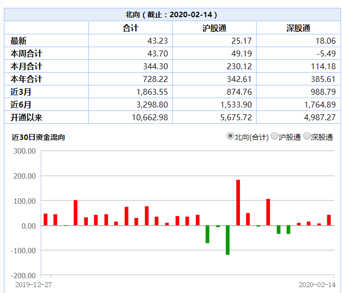 根据Wind数据库统计,北向资金在本周合计流入43.70亿元,其中,沪股通净买入49.19亿元,深股通净卖出5.49亿元。除本周一(2月10日)外,每个交易日的北向资金都呈现净买入状态。