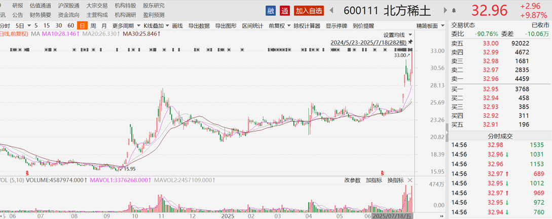 稀土在给产业链带来一些“小小震撼”的同时,也在二级市场生动上演了一出战略价值重估的行情。以A股稀土龙头北方稀土为例,其本月累计涨幅超32%,7月18日股价创下了近两年以来新高。