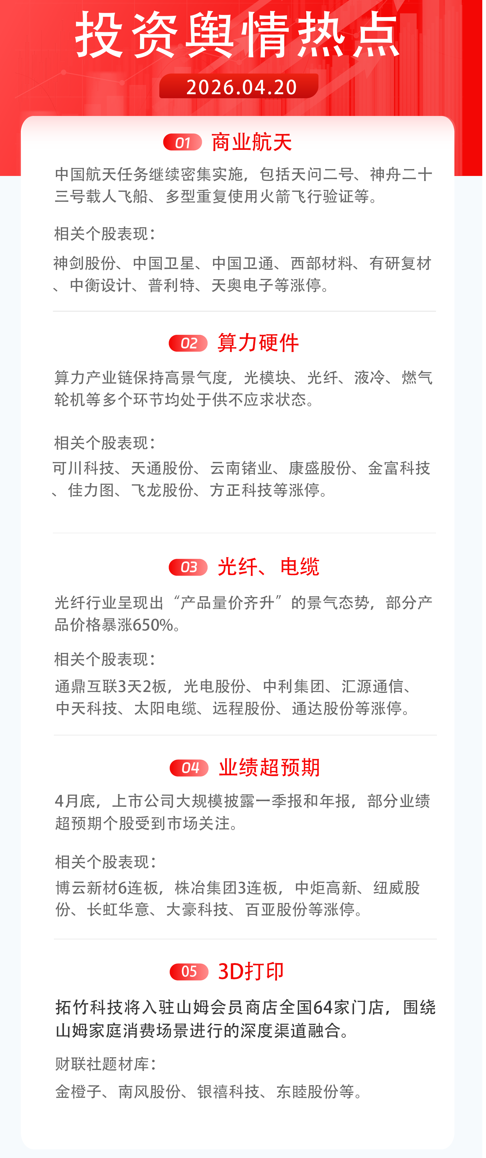 4月20日舆情热点:商业航天、算力硬件、光纤