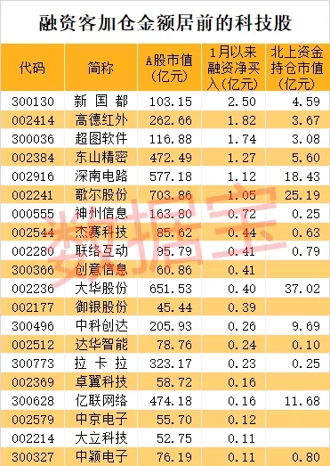 融资客1月份以来也是动作不断,数据显示,A股融资余额在去年底突破万亿元之后,仍在不断上升,目前已达到1.03万亿元。1月份以来累计净买入321.66亿元,在不到半个月的时间里,6只科技股获融资客加仓超亿元,分别是新国都、高德红外、超图软件、东山精密、深南电路、歌尔股份,融资客加仓金额最大的是新国都,累计净买入2.5亿元。