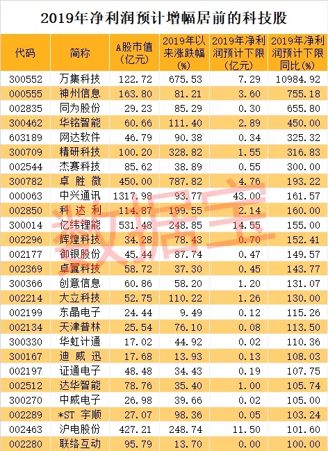 在业绩预计翻倍的科技股中,不乏细分科技领域的龙头,如中兴通讯、亿纬锂能、沪电股份、卓胜微。中兴通讯为5G通信设备龙头,公司预计2019年净利润为43亿元至53亿元,同比增长1.62倍至1.76倍,该股昨日收盘价也已创一年来新高。亿纬锂能为锂电池龙头,公司预计2019年净利润为14.55亿元至16.27亿元,同比增长1.55倍至1.85倍。沪电股份为PCB行业龙头之一,公司预计2019年净利润为11.5亿元至12.5亿元,同比增长1.02倍至1.19倍。卓胜微为射频前端芯片龙头,公司预计2019年净利润为4.76亿元至5.08亿元,同比增长1.93倍至2.13倍。