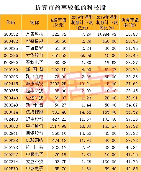 按照净利润预计下限计算,部分科技股市盈率水平将进一步降低。数据宝统计显示,9股折算后市盈率在30倍以下。折算市盈率最低的是万集科技,折算后市盈率降至16.83倍。市盈率低于贵州茅台。其次是华铭智能,折算市盈率为20.96倍。然后是三雄极光,折算市盈率为21.96倍,公司预计2019年净利润为2.34亿元至2.7亿元,同比增长30%至50%。折算市盈率较低的还有大华股份、春秋电子、聚飞光电、新国都、恒华科技、海康威视等。