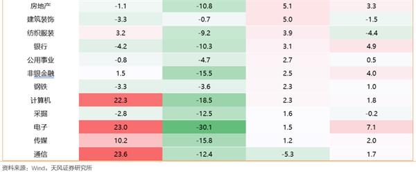 (2)在大部分时候(比如景气度显著高或者非常差的时候,图12的前三行和后四行),相对收益角度,涨的多、估值高不是减仓一个行业的理由,跌得多、估值低也不是加仓一个行业的理由。只有当行业处于稳定增长阶段时(中等增速区间0~30%,图12的中间三行),配置时点估值高低,对于未来一年股价有较强的区分度。