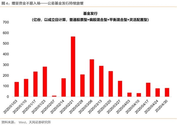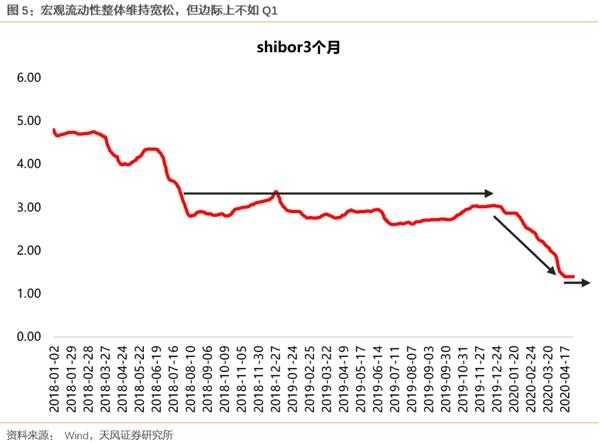 我们理解,增量资金之所以不愿意入场,有几个方面的因素:(1)当前不确定性的因素还比较多,市场赚钱效应较差。这些不确定性因素包括了宏观层面全球复工的进展、中美关系,微观层面二季度部分行业业绩和订单的不确定性等。(2)宏观层面流动性虽然还保持宽松,但是边际上来说,随着国内复工加速,资金脱虚入实,银行间利率水平从Q1的快速下中枢,改为了近期的中枢震荡,这也是日历效应背后的逻辑,和在大部分Q2都会发生的情况。