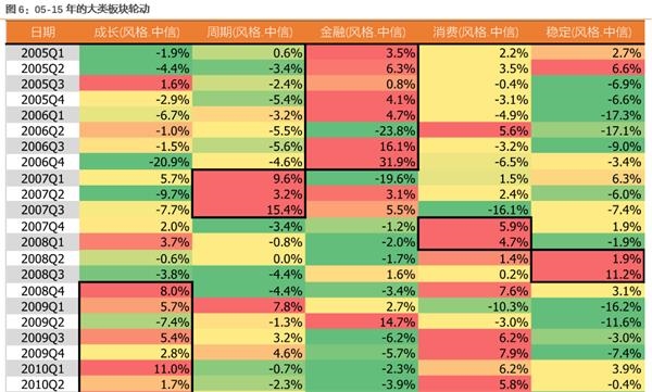 (1)在05-15年这段时间内,大类板块的轮动能够看出比较明确的切换轨迹,基本是以年度或者更长周期为单位。(如图6所示)