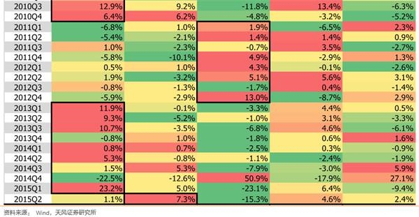 下图中,每一个数字代表当季度该类板块相对于wind全A的超额收益。黑色方框圈出的板块,代表一个阶段,相对较强的一类风格。