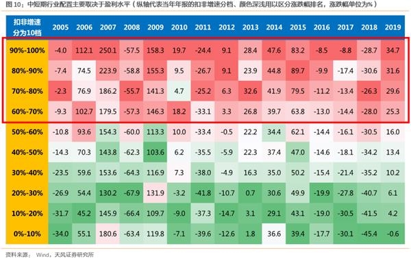 (1)把每年个股的涨跌幅按照由高到低分为10档,测算每档的扣非利润增速(当年年报)中位数;