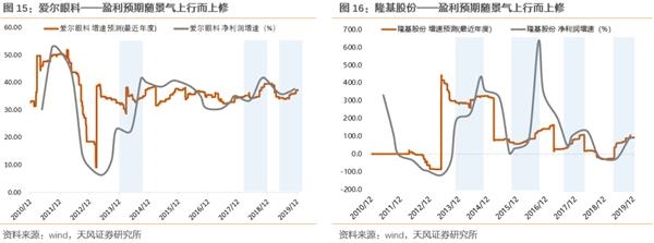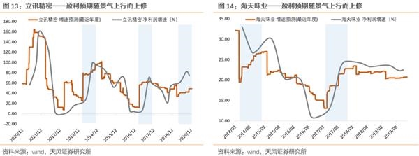 凡是景气度上行的周期中(图中蓝色背景区间),盈利预测的一致预期都是在不断上调,也就是意味着虽然以当前盈利预测判断的估值可能比较贵,但是随着盈利预测的上调,高估值会被消化掉。