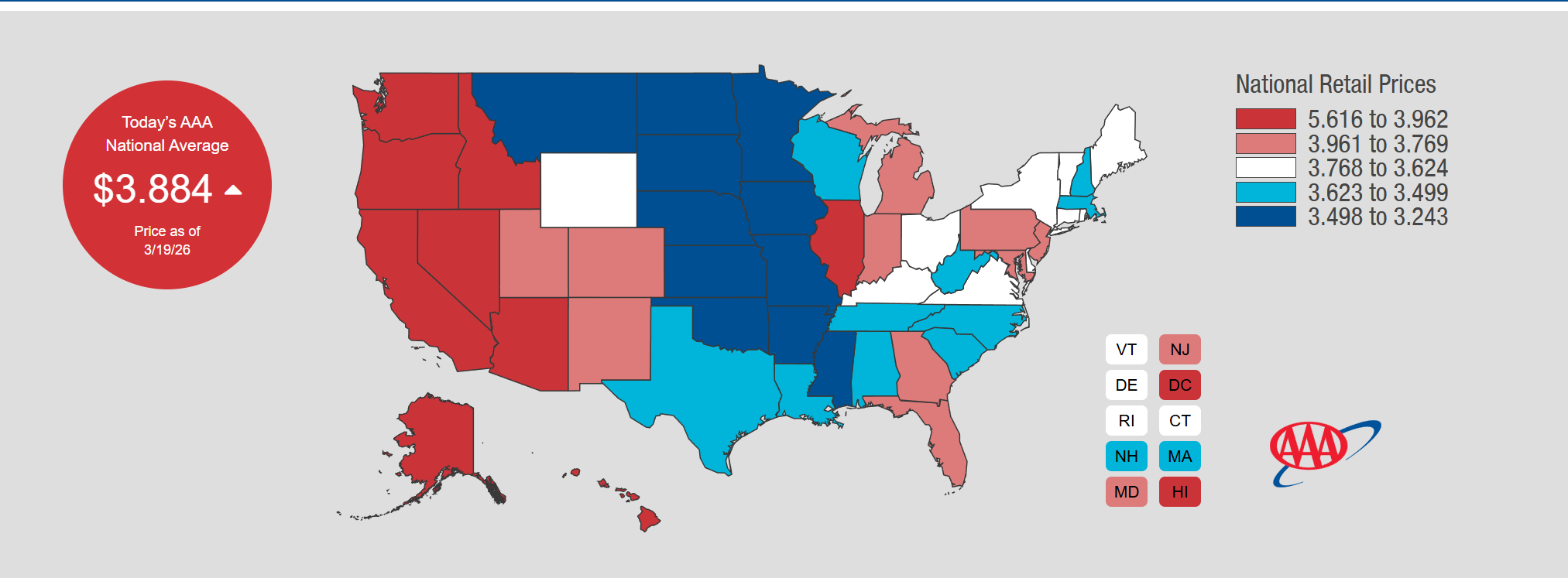 根据美国汽车协会(AAA)的数据,截至美东时间周四,美国全国平均零售汽油价格为3.88美元/加仑。同期,美国西德克萨斯中质(WTI)原油期货价格上涨近30美元,涨幅达43%,从每桶67.02美元涨至96.14美元。