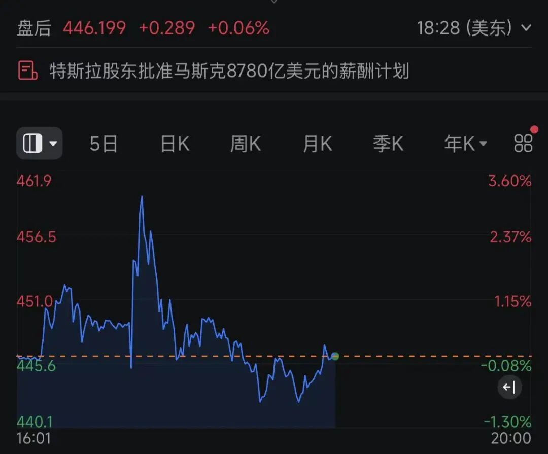 股东大会批准薪酬方案后,周四收跌3.5%的特斯拉股价盘后曾转涨,一度涨超3%,但此后又跳水。